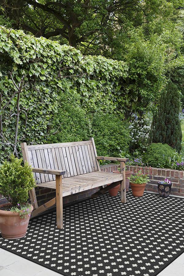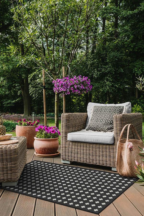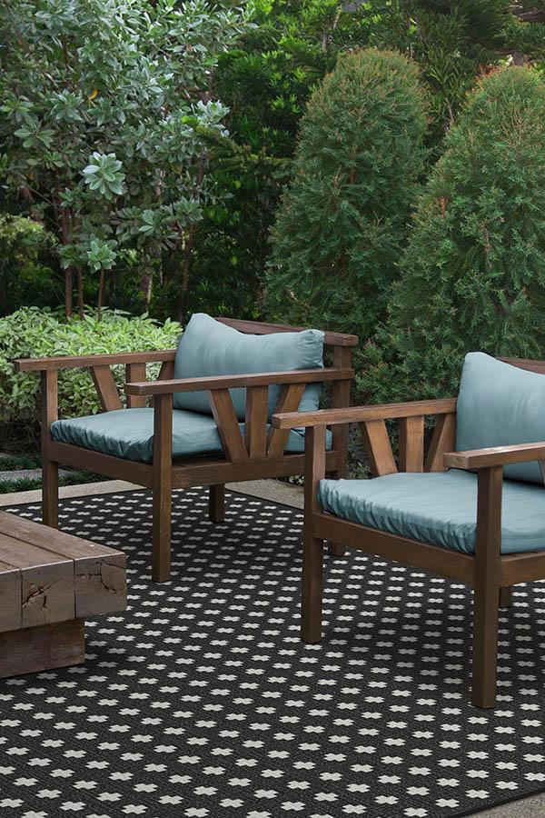 Complement your outdoor decor with our Outdoor Adde Black Rug. Featuring an all-over print of off-white crosses laid out on a black canvas, this modern outdoor rug will add a chic accent to your patio or deck.