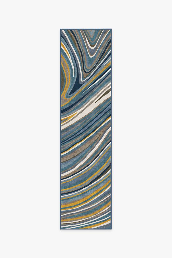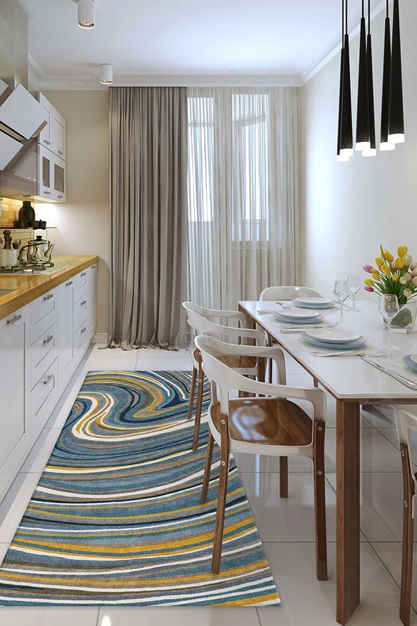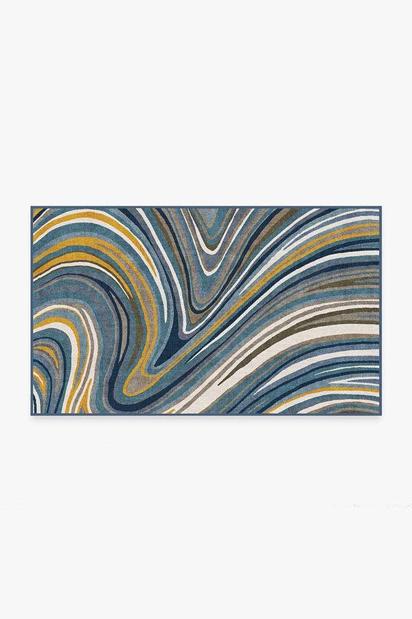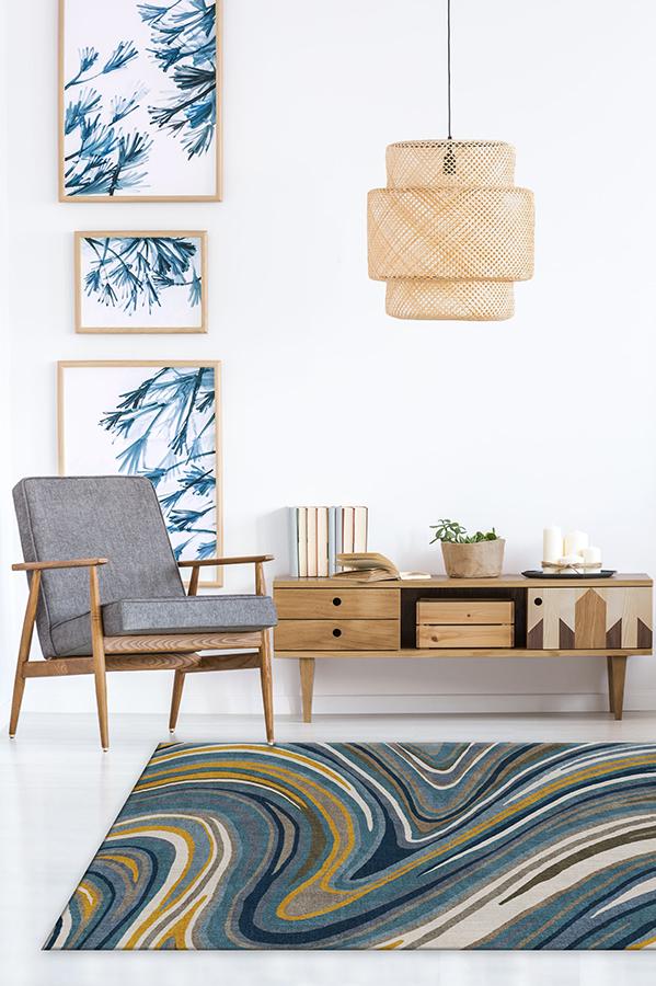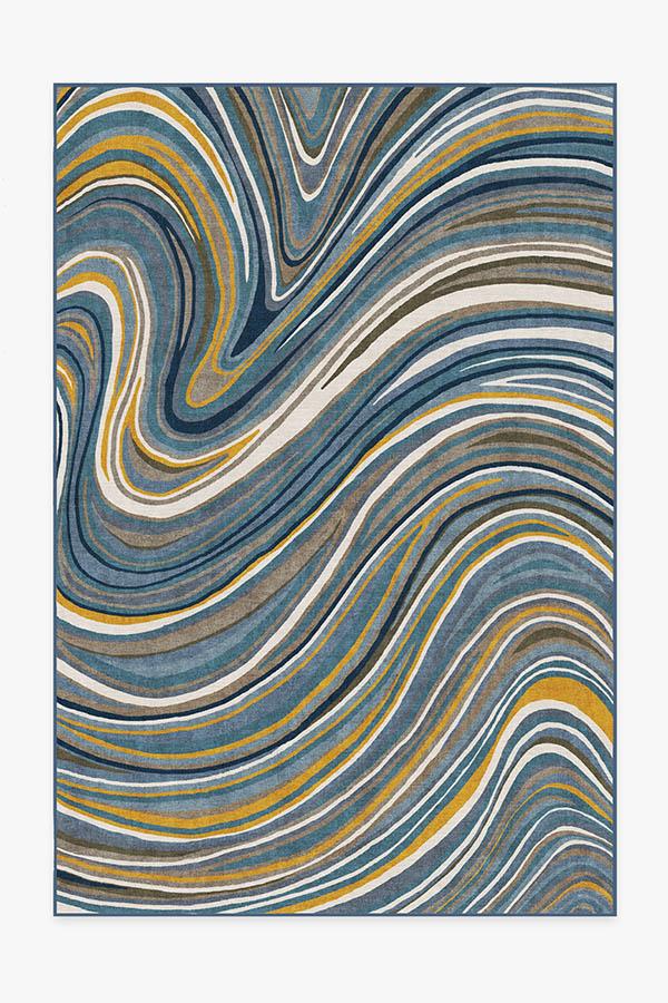 Inspired by the gemstone known to promote harmony and balance, our Agate Golden Azure rug will beautifully complement your current home furnishings. The exquisite motif of wavelike curves is displayed in a myriad of oceanic colors including slate blue, Nordic blue, Danish yellow, oyster and eggshell. A perfect design decision to anchor and add energy to any modern, contemporary or coastal style room.