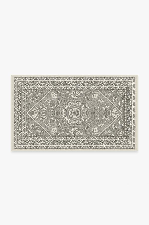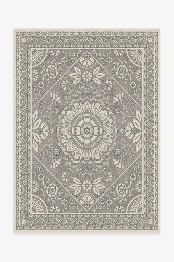 Blending traditional composition with modern details, this Almana Black & White Rug is all about lasting style. This classic traditional rug-style layout is made new again by floral elements and hand-drawn dots sprinkled throughout the negative spaces, adding depth and interest. Neutral tones of grey and pearl make this rug beautifully versatile.