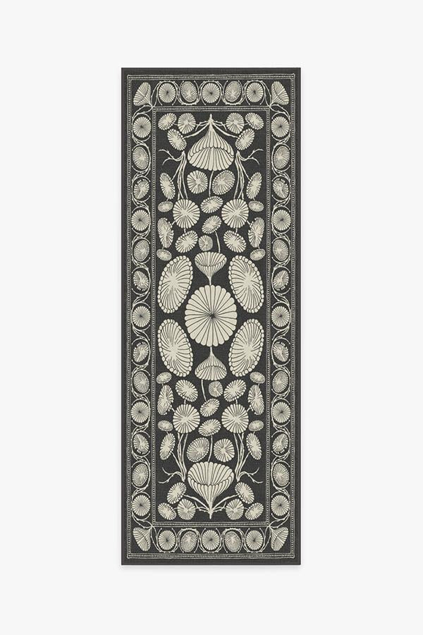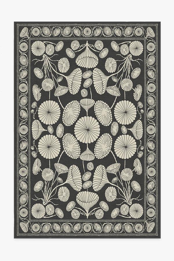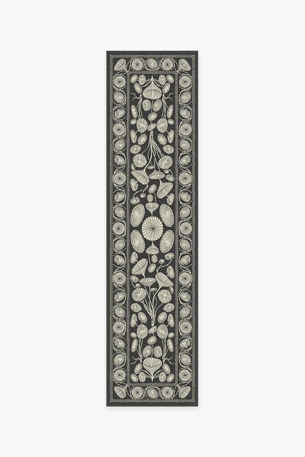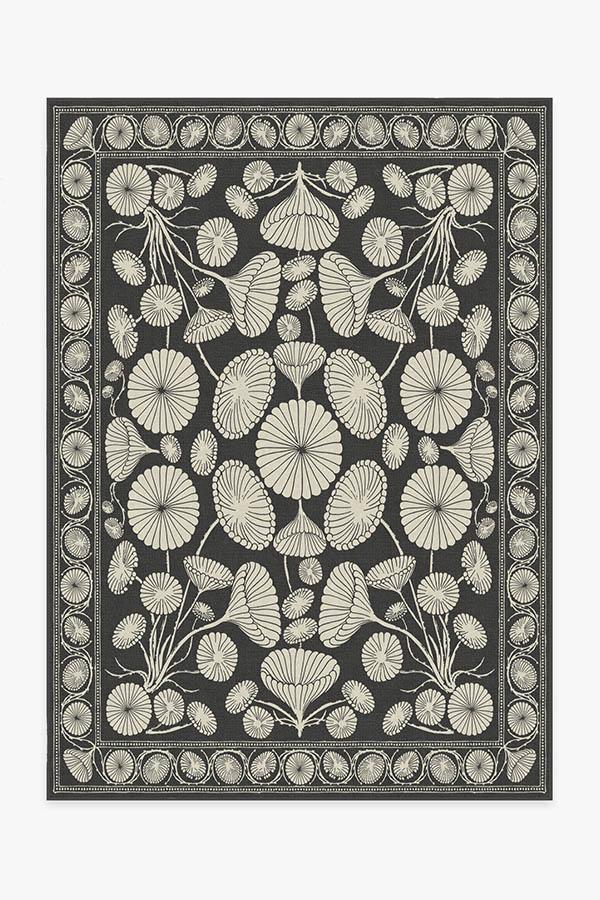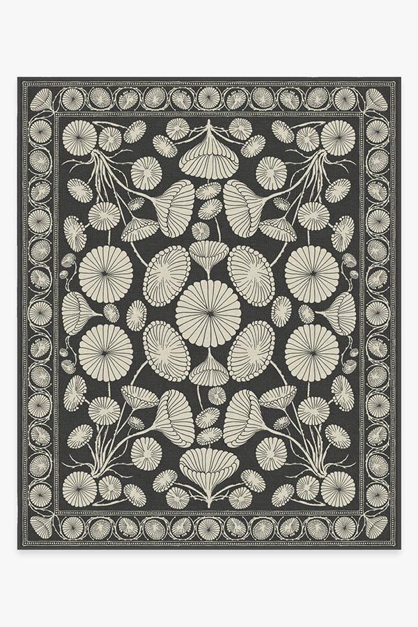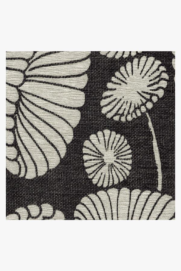 The Cynthia Rowley Suzani Black Rug enchants any room with grace. Its bell-shaped blooms and flower trumpets are rendered in elegant hues of dark grey and sand, edged with a floral border and connected by long, graphic stems.