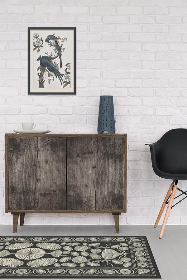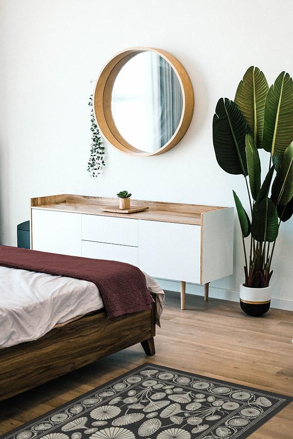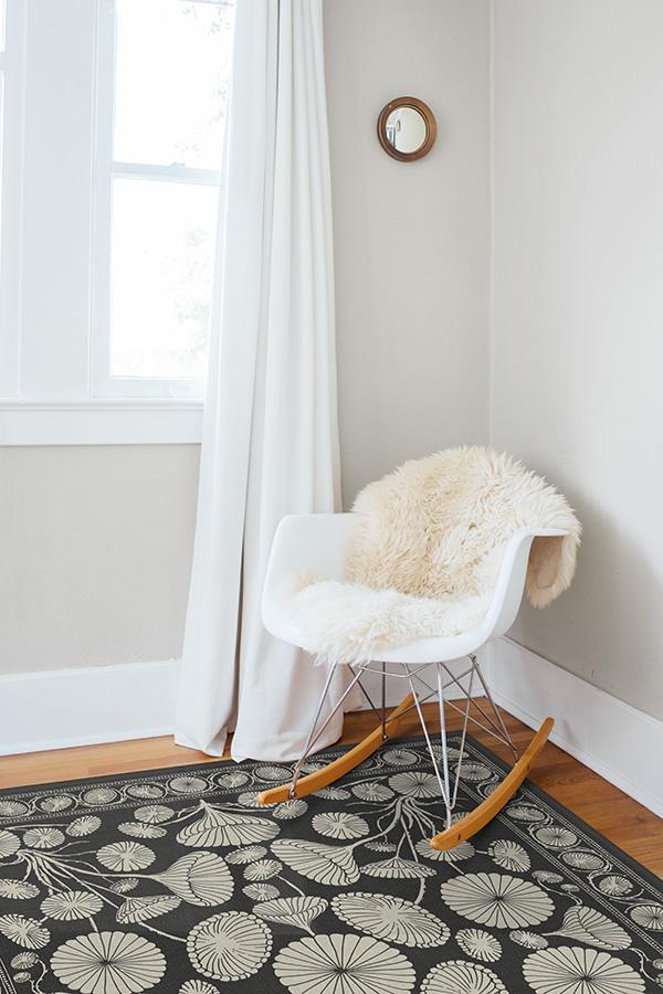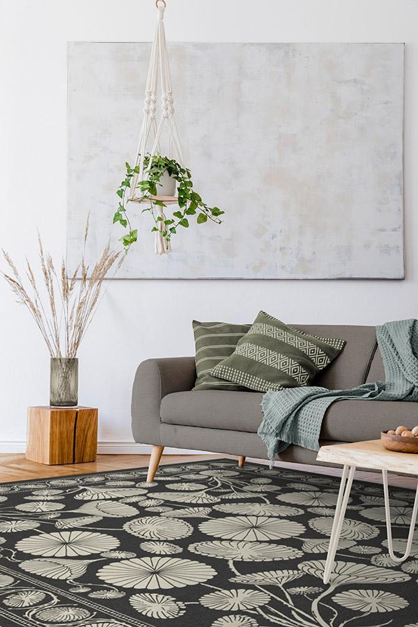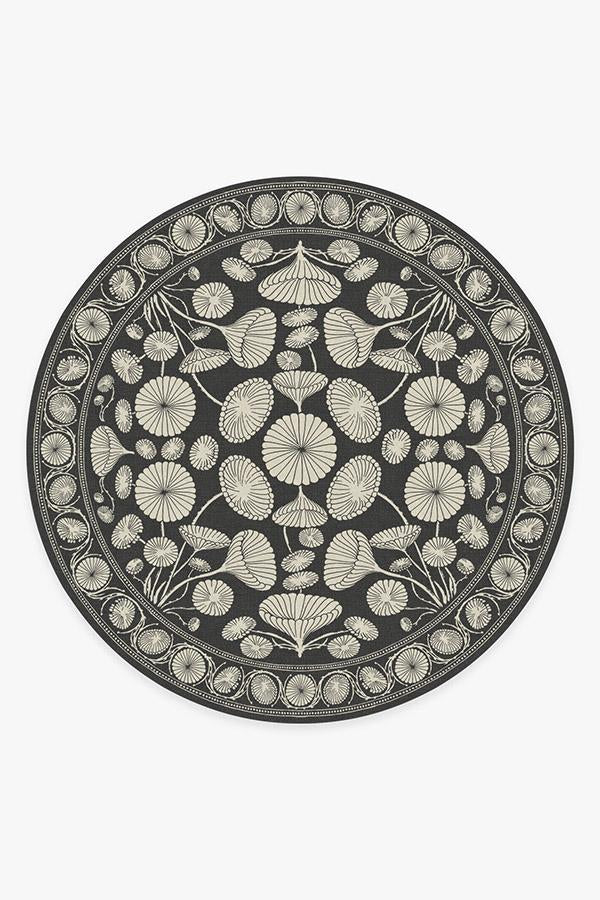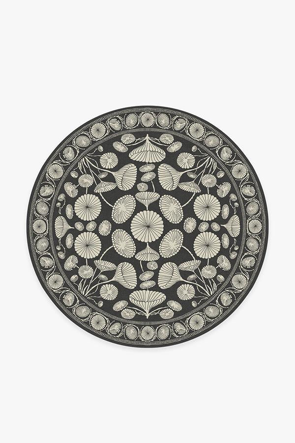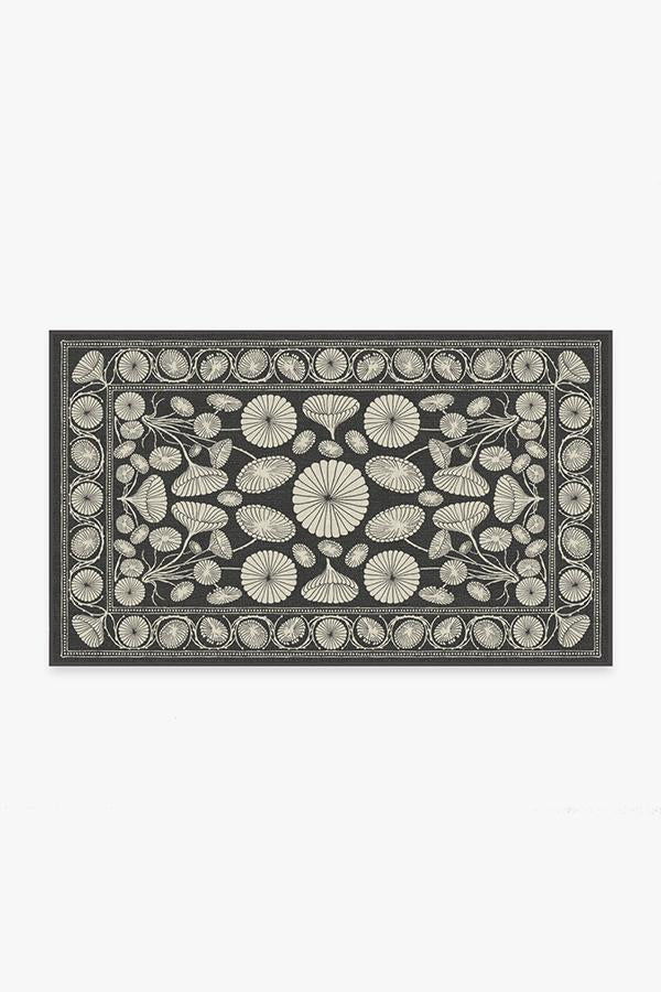 The Cynthia Rowley Suzani Black Rug enchants any room with grace. Its bell-shaped blooms and flower trumpets are rendered in elegant hues of dark grey and sand, edged with a floral border and connected by long, graphic stems.