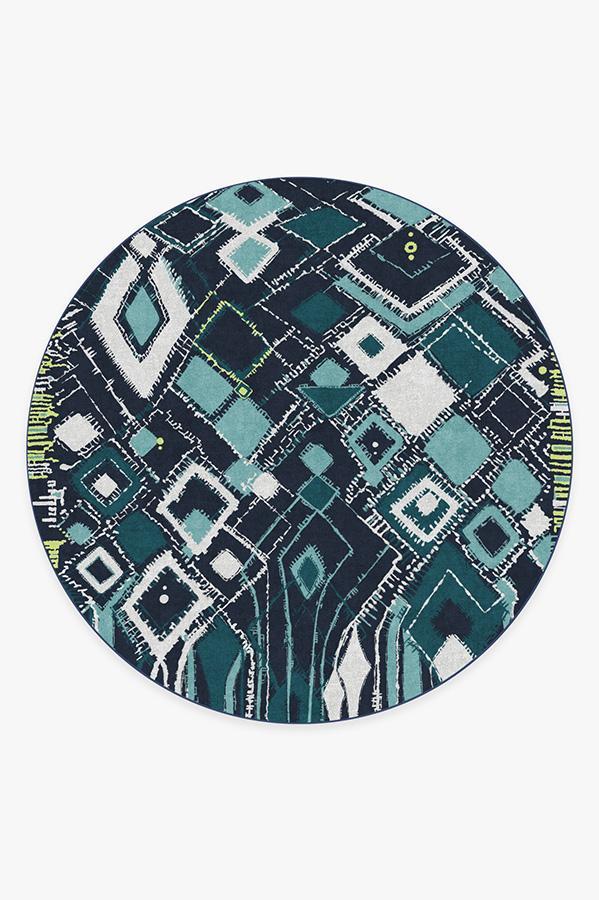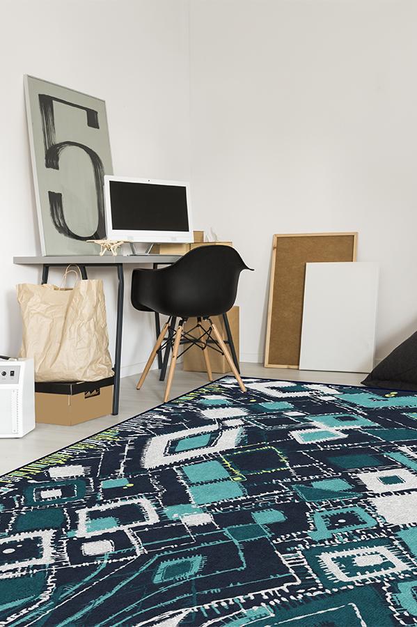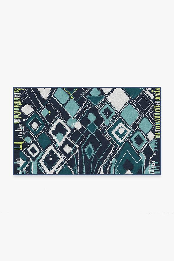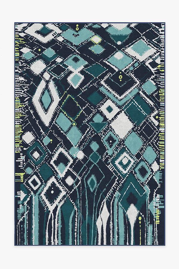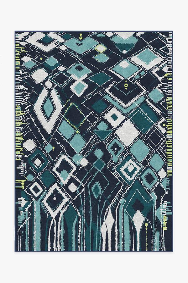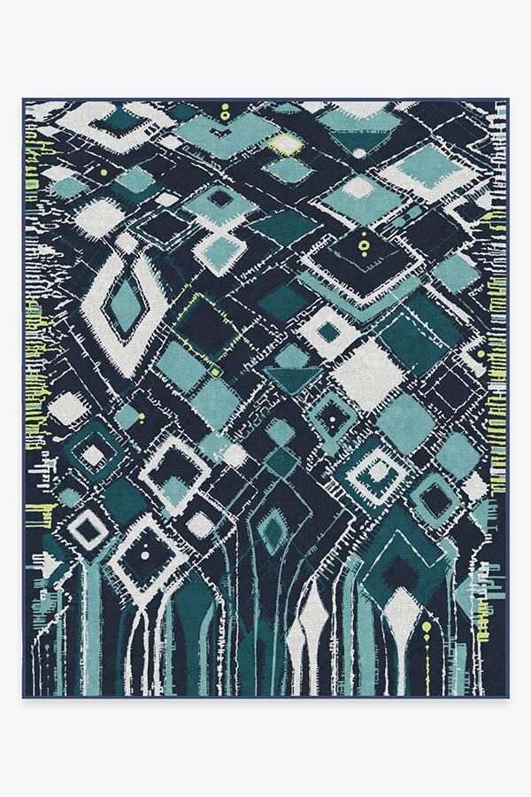Adorn your floors with artistic flair by laying down our Delikesh Midnight rug. This mosaic-meets-abstract motif is colored in high-contrasting hues of navy, turquoise, teal and granny apple green. Excite any room with this unique and dynamic floor decor piece in any urban or suburban interior.