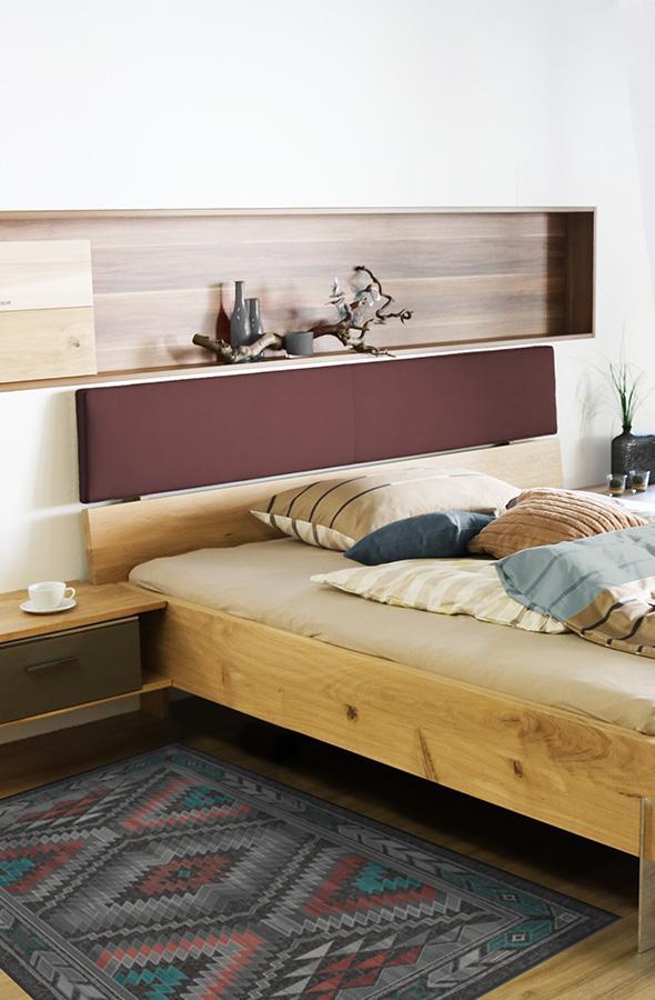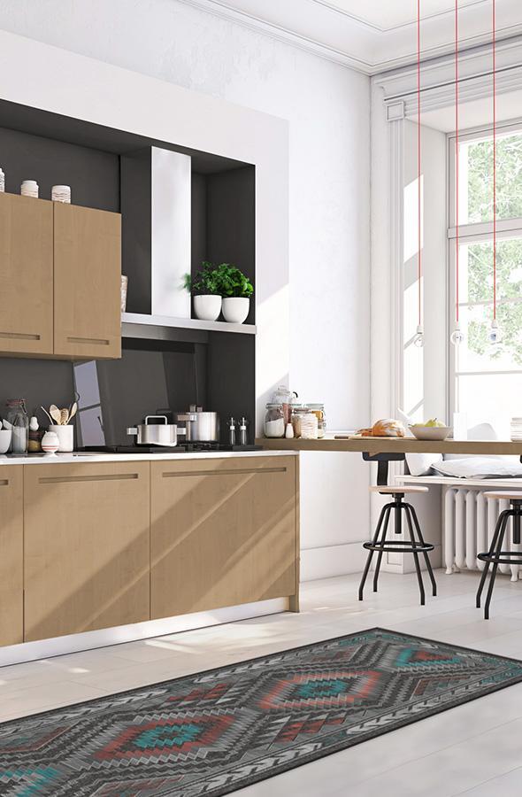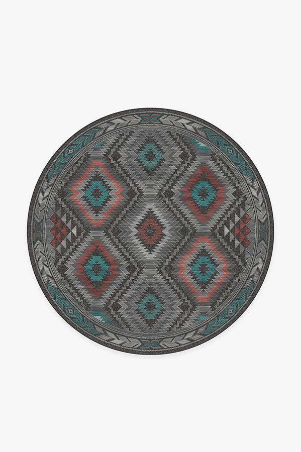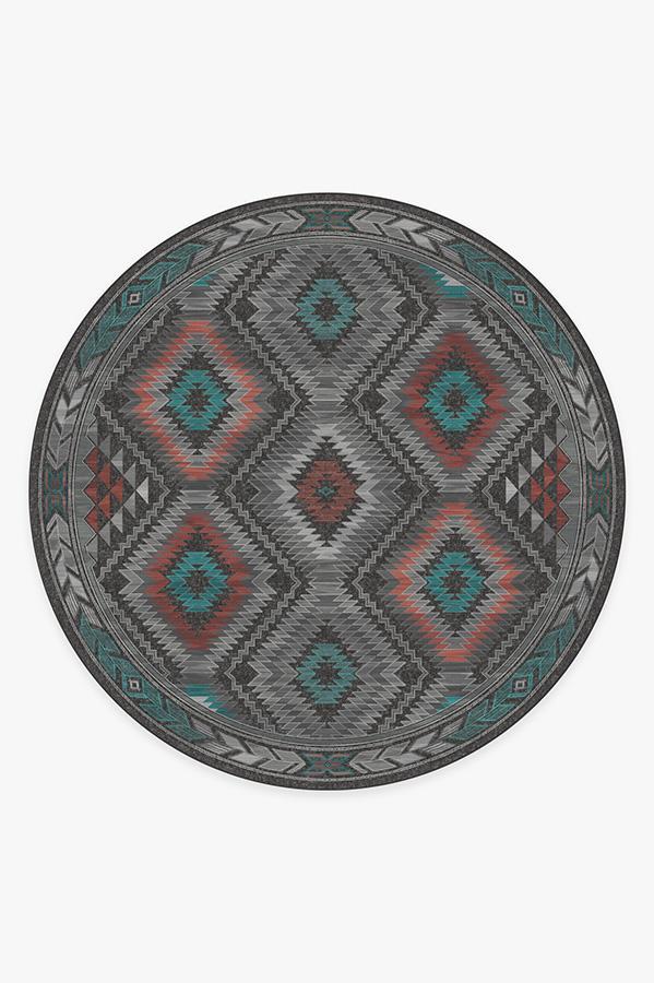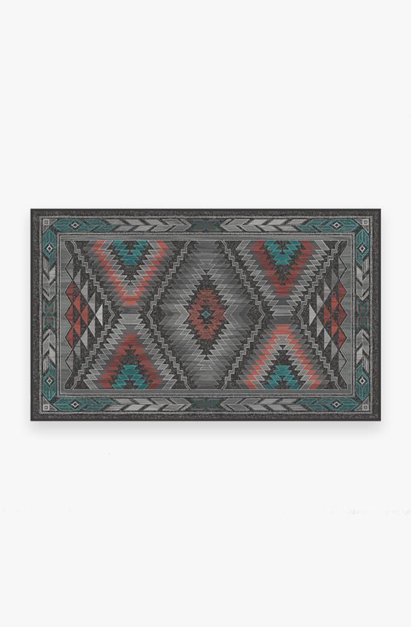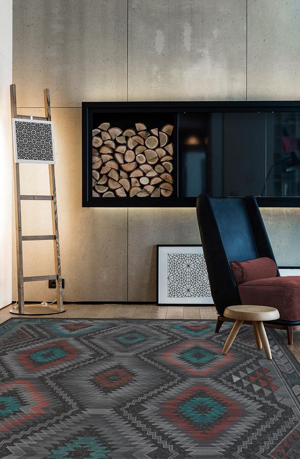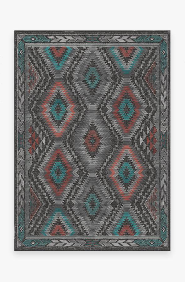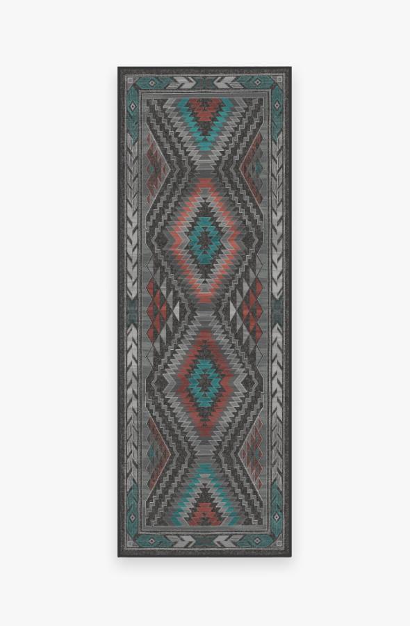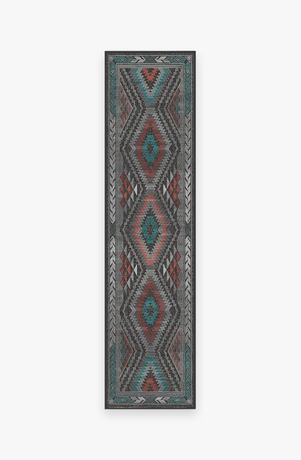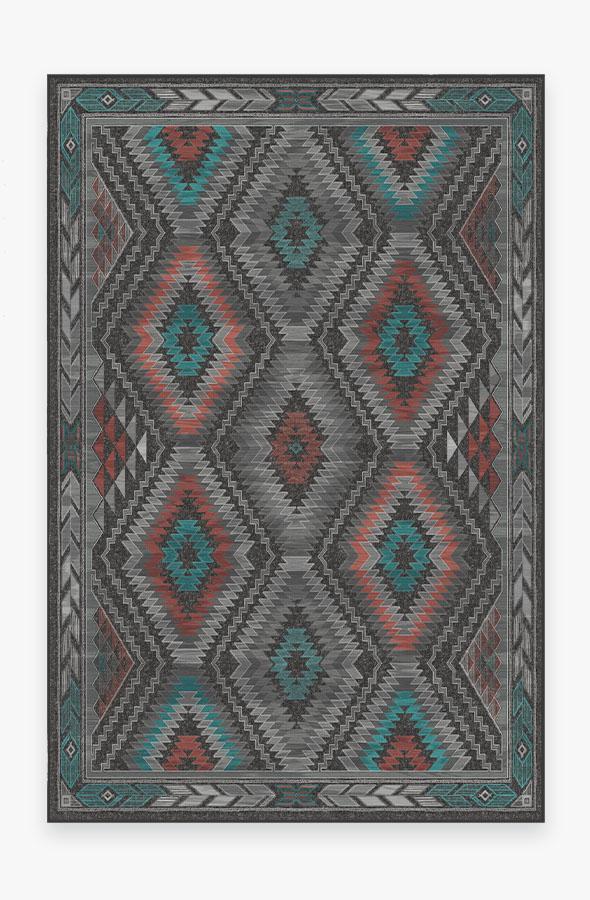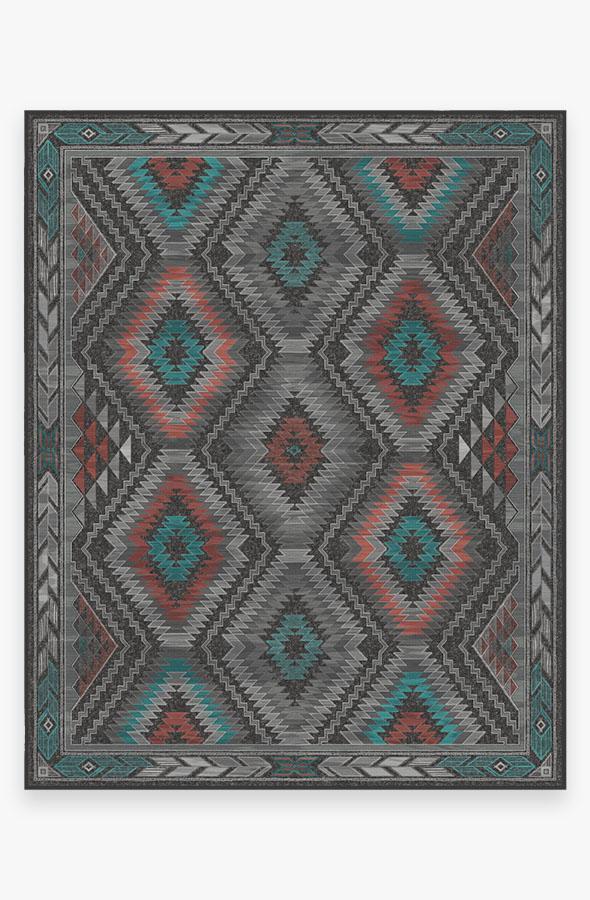 The Dessa Diamond Charcoal Rug turns up the energy with its modern twist on the traditional diamond motif. High-contrast tones of charcoal, brick red, and teal blue highlight this striking geometric motif; while two-toned zigzags and triangles line the borders, creating a dynamic effect that commands attention.