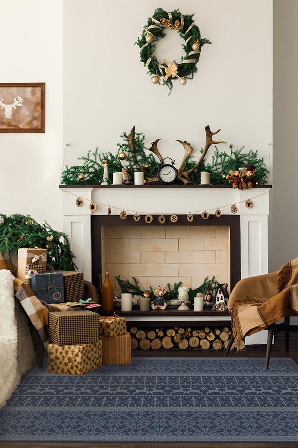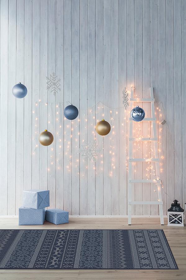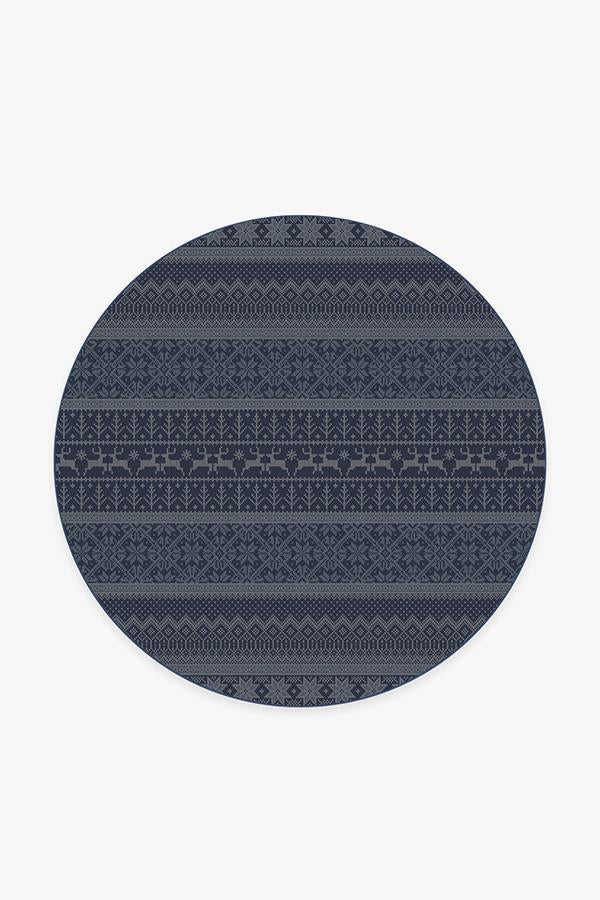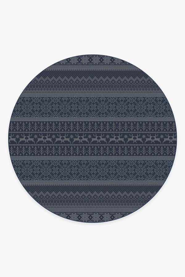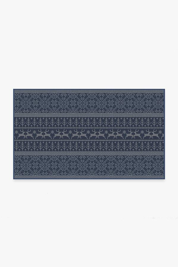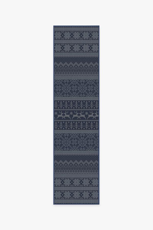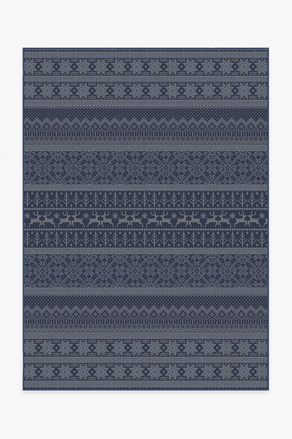 Inspired by the traditional, hand-knitted designs of Shetland Islandsâ Fair Isle, our Fair Isle Blue rug features a multi-band of intricate and festive designs, including the trademark star motif, holiday trees and reindeer in hues of Nordic and midnight blue.