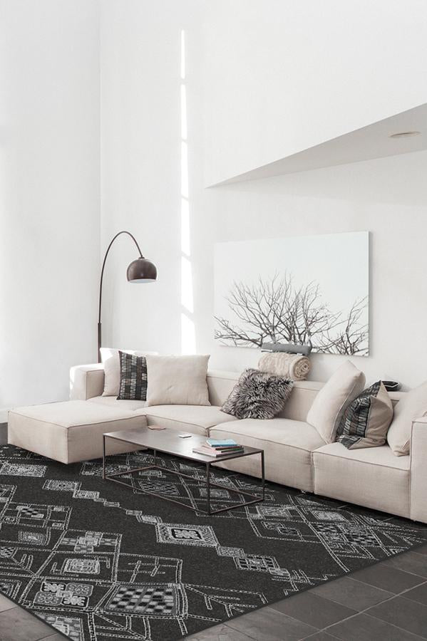 If you are looking to bring an elegant and exotic touch to your home interior, try laying down our Farah Charcoal rug. These neutral-and-now hues of grey on charcoal feature a Moroccan-inspired motif of diamonds and tribal designs that you can easily style alongside an array of colors, wood, metal and stone. Adorn your floors with faraway splendor in any urban or suburban home.