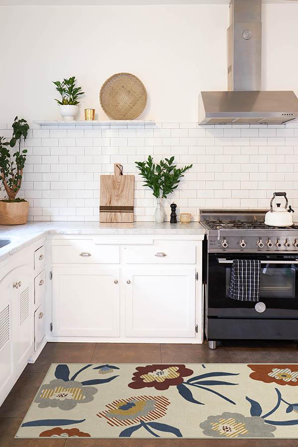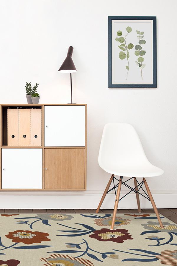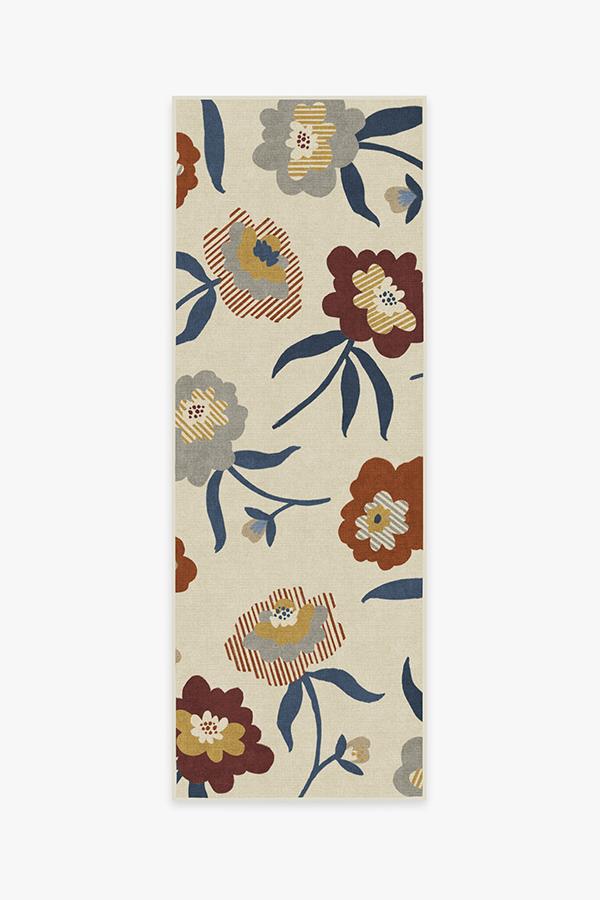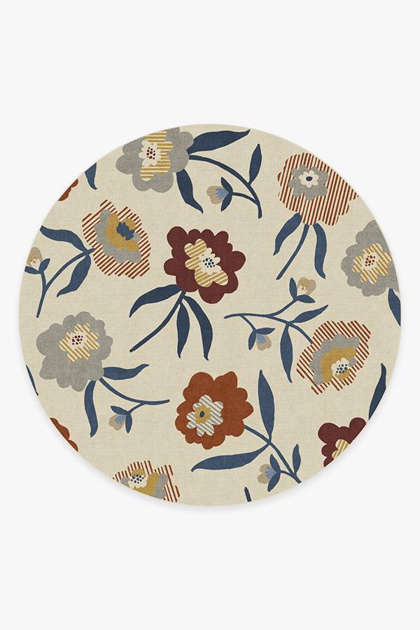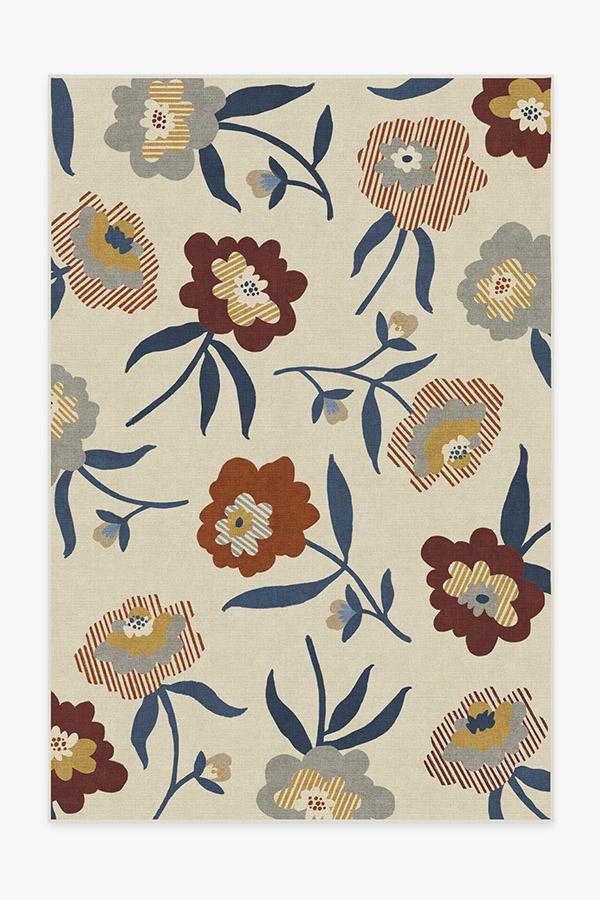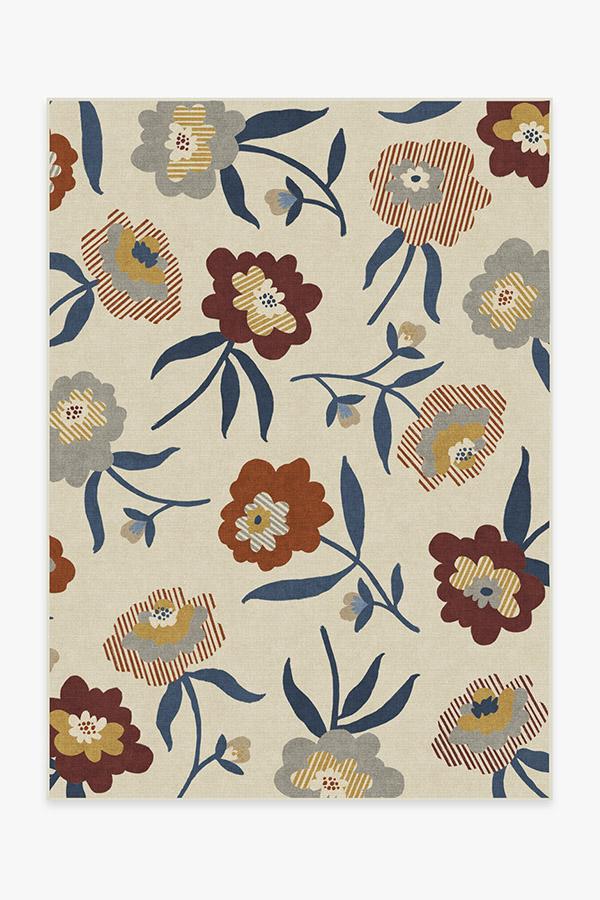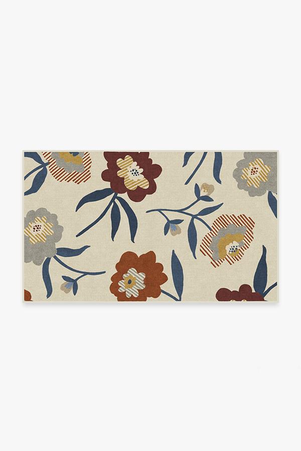 Throw a garden party on your floor with our Fleur Margaritte Amari Rug. Featuring a colorful field of daisies, in slate blue, coriander, and rust orange on a light cream background, this floral rug will add a chic and sophisticated touch to any room.