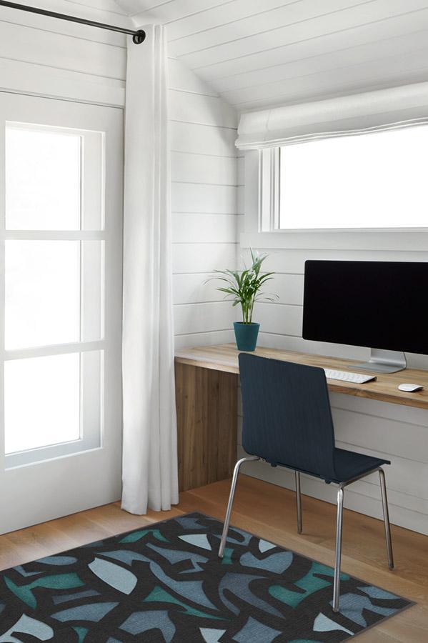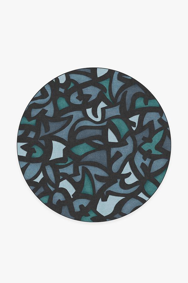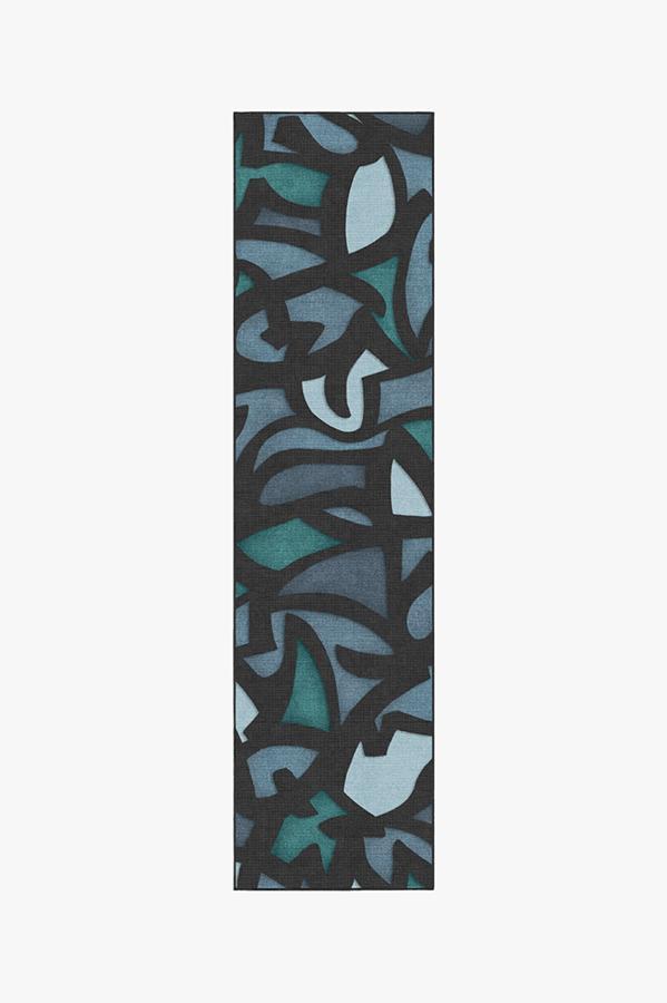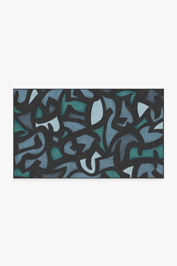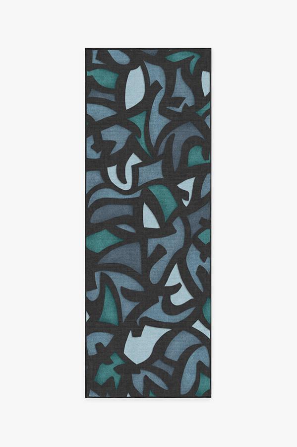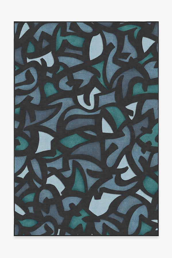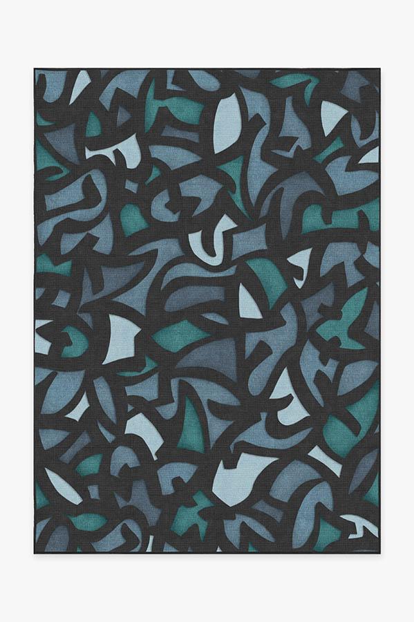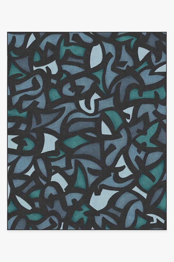 This street art-inspired Lumen Blue Rug is reminiscent of stained glass windows viewed from outside. Its edgy design features thick graffiti lines and abstract shapes in pops of blue and teal.