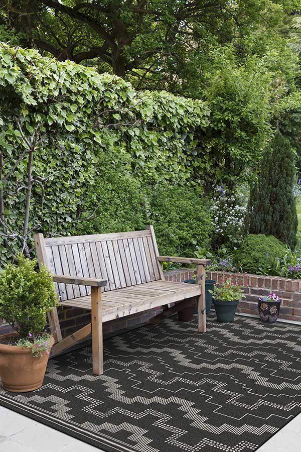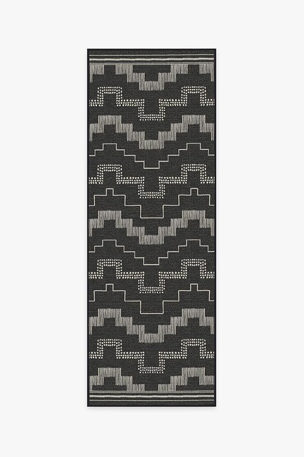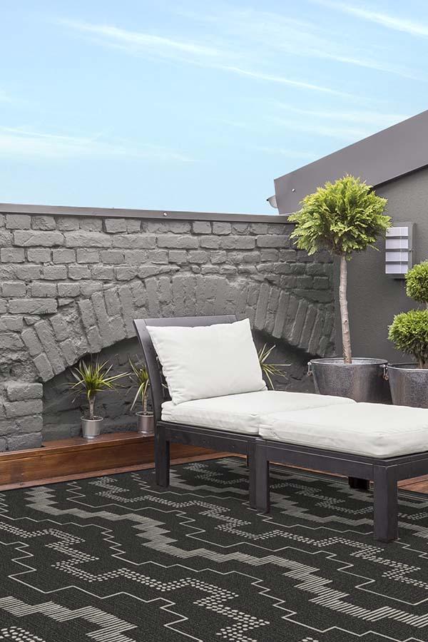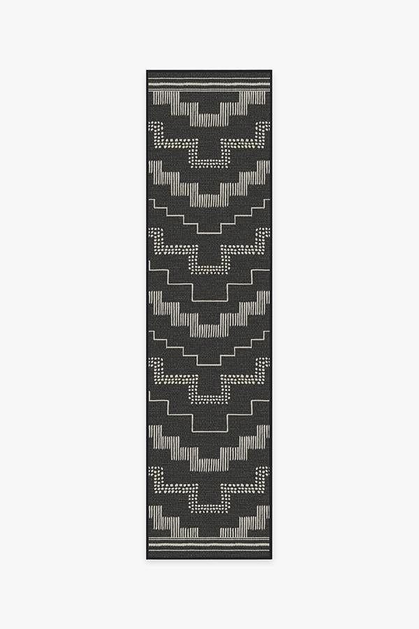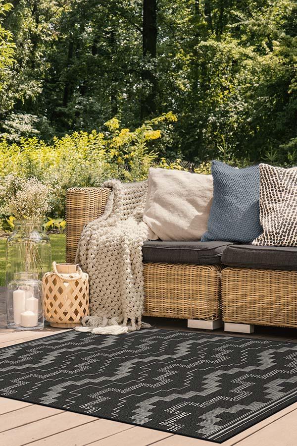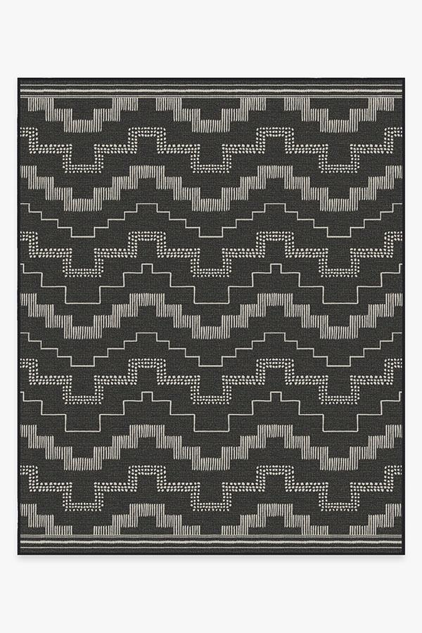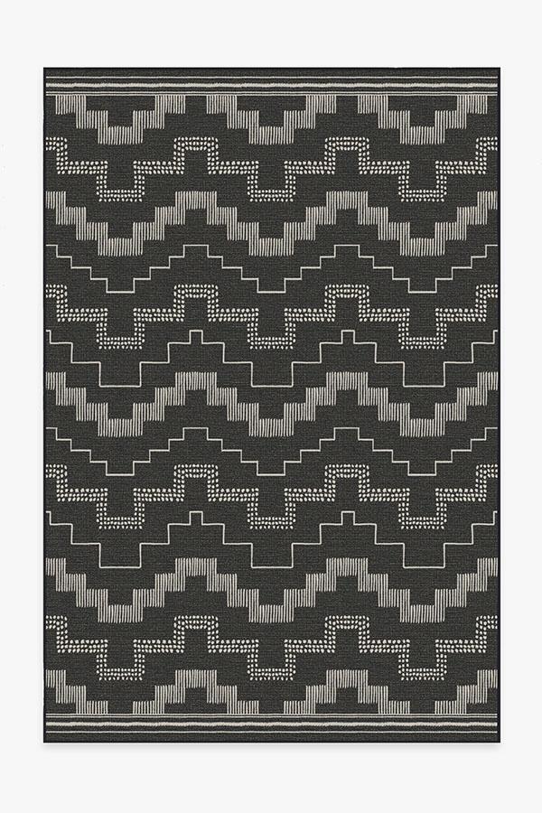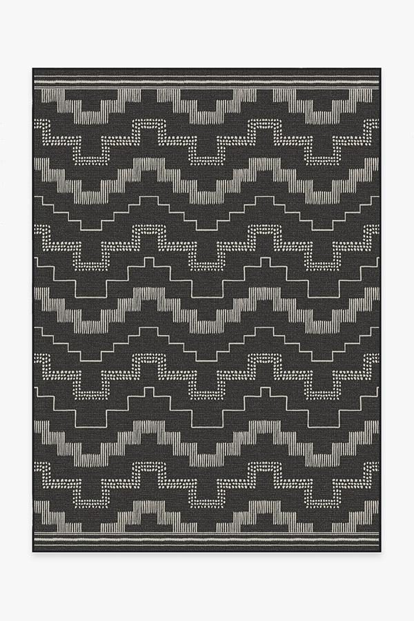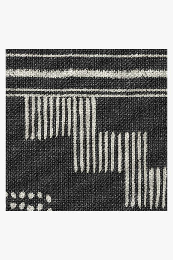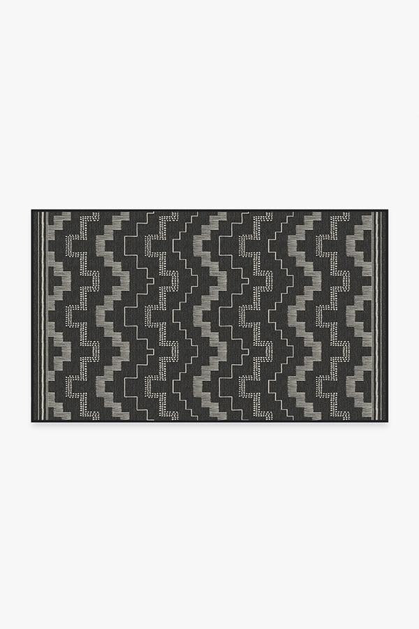 Elevate any outdoor deck decor with our Outdoor Meseta Black Rug. Tinted in high-contrast colors of black and off-white, this modern geometric design showcases layers of lines, dots, and blocks resembling rocky terrains that have endured the passage of time.