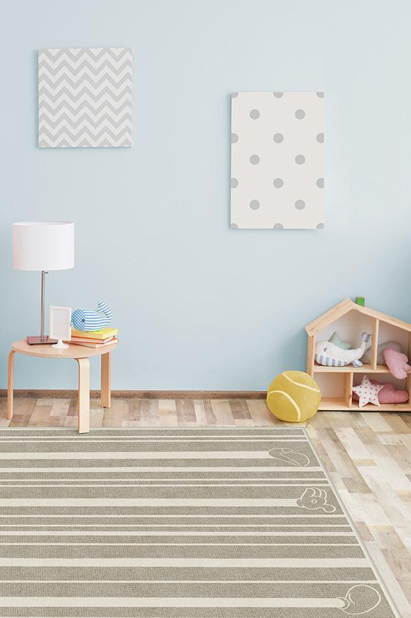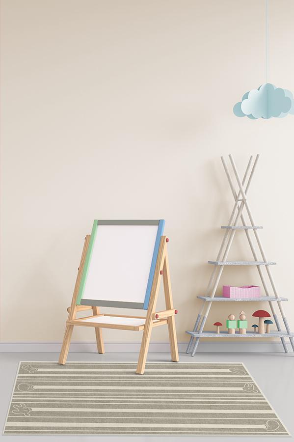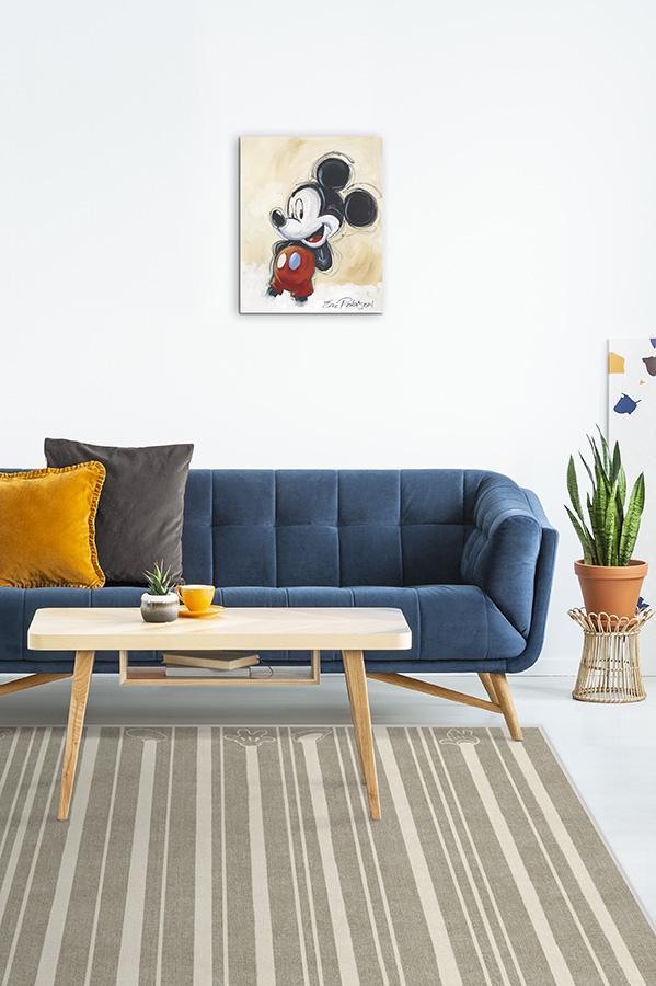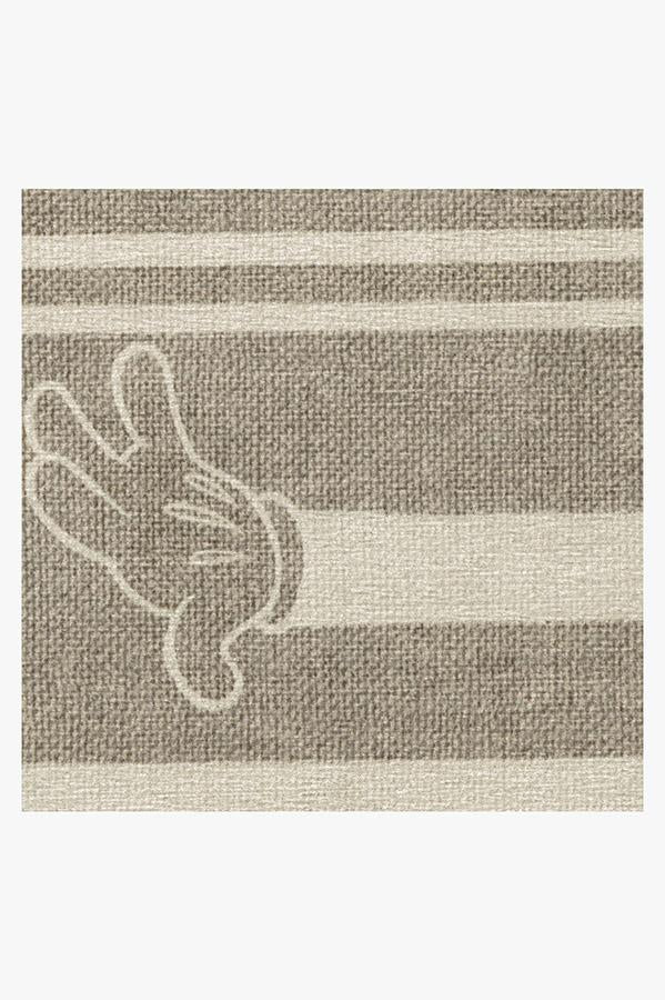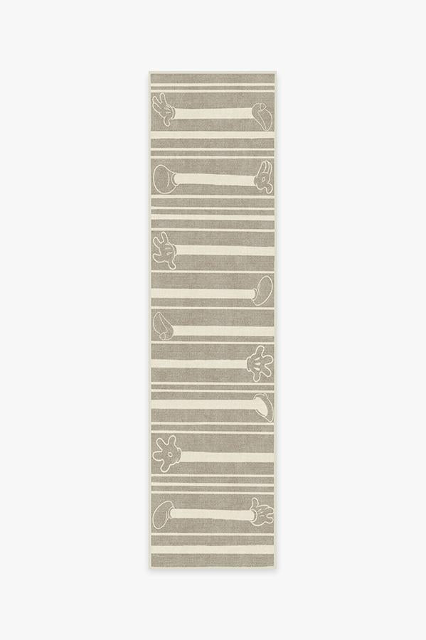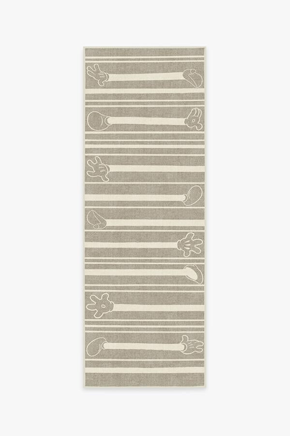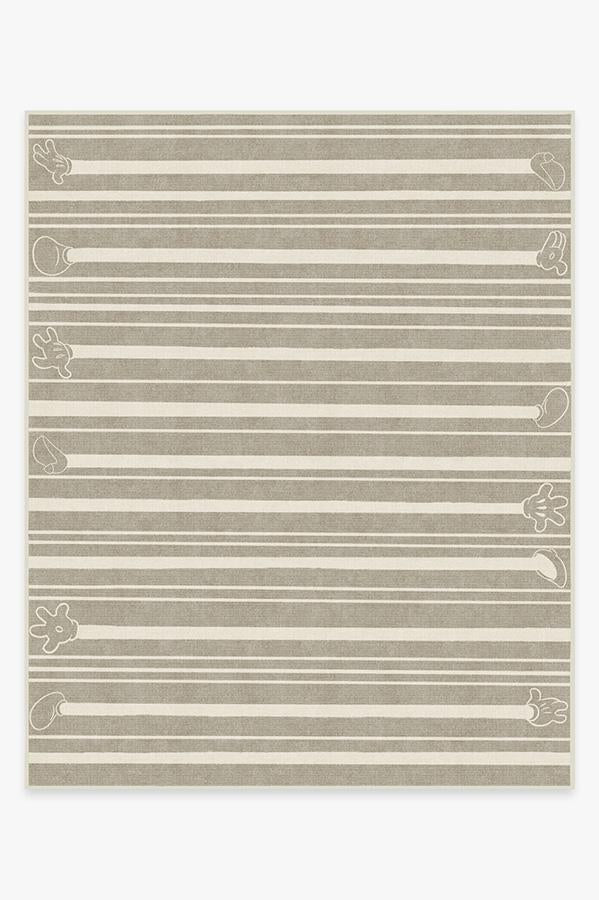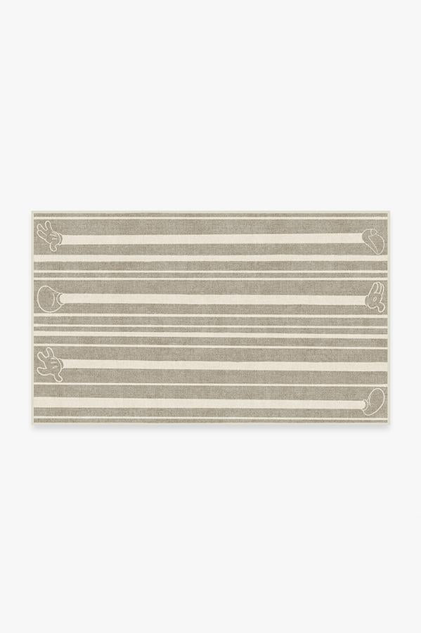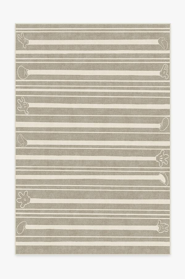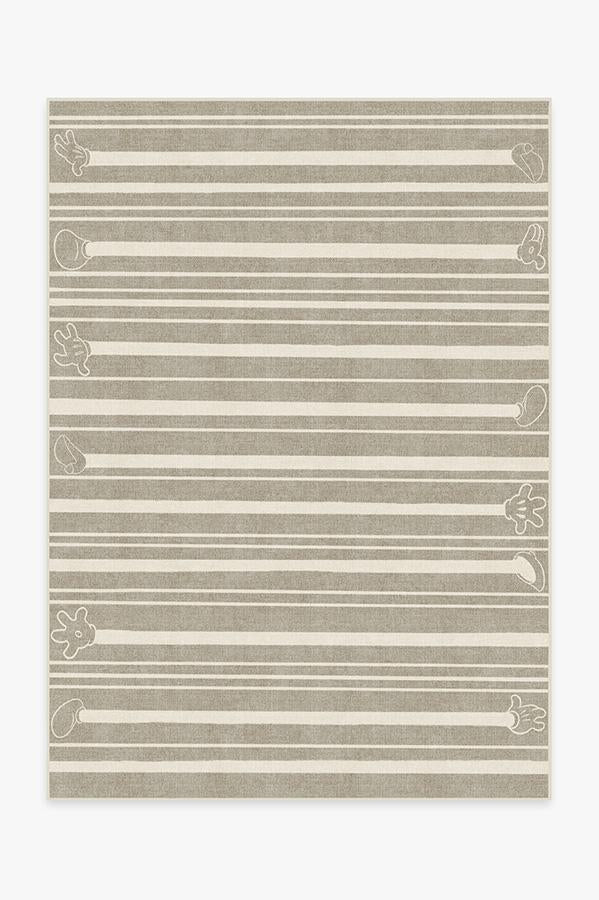 Our Mickey Stripe Stone Rug gives the simple striped rug motif a whimsical Disney spin. This playful design features Mickey and Minnie's iconic gloves and shoes, connected by fine and bold lines in hues of dove grey and sand dollar to mimic the vintage, cartoon-like feel of classic Disney films.