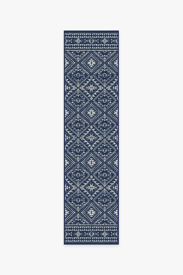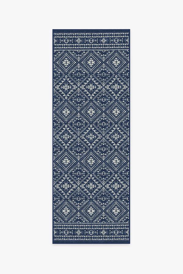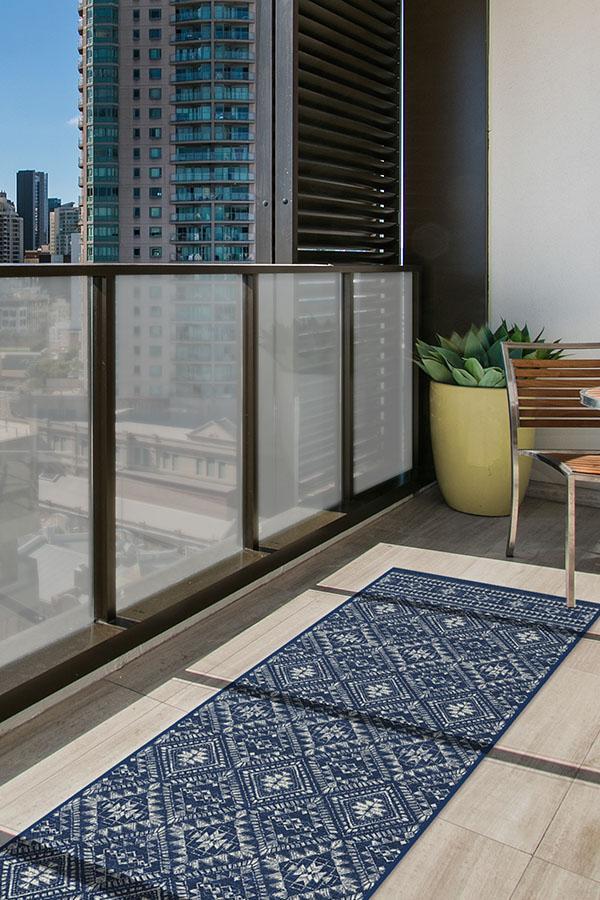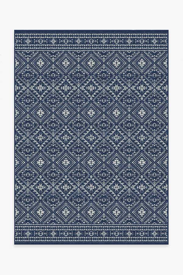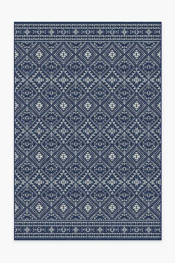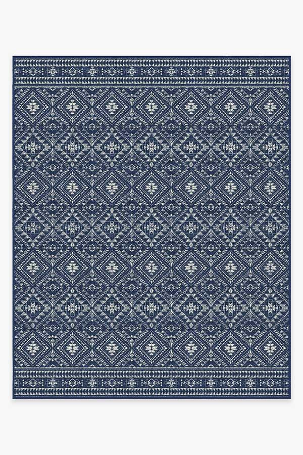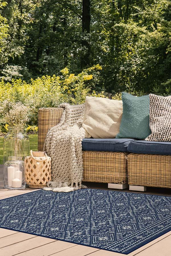 Our Outdoor Nomada Navy Rug complements any bohemian, modern, or neutral outdoor spaces. Intricate geometric details form larger diamond patterns in this blue outdoor rug, giving your porch or patio a stylish update.