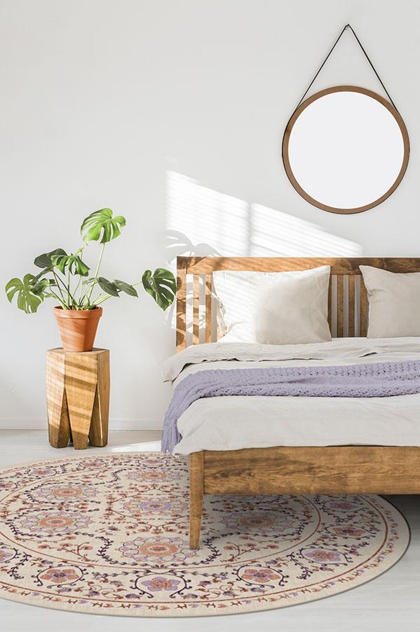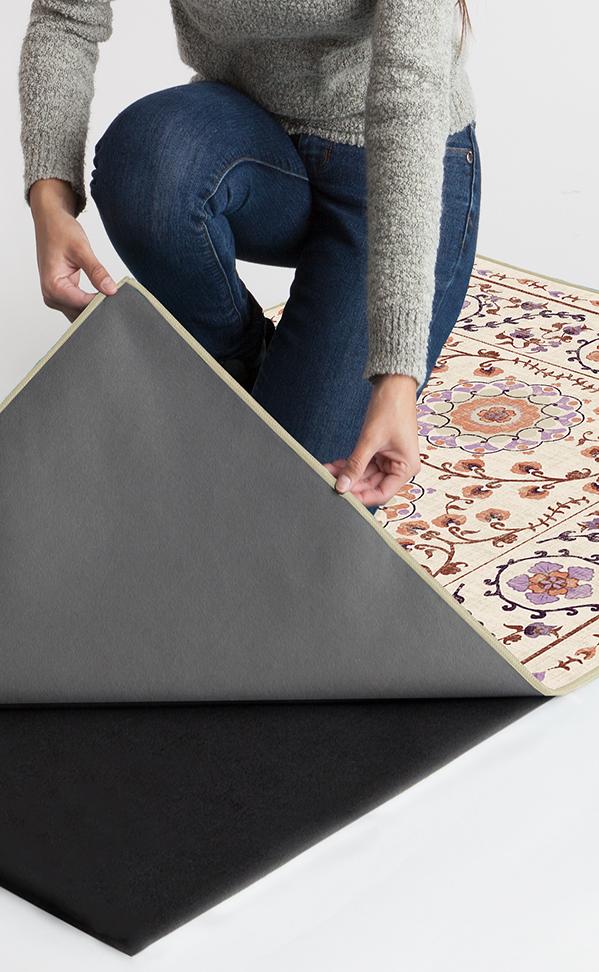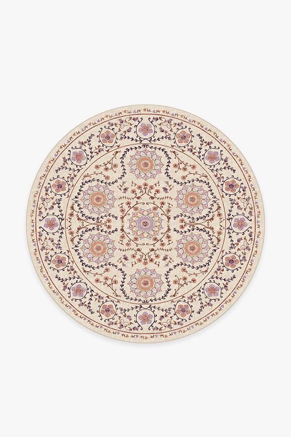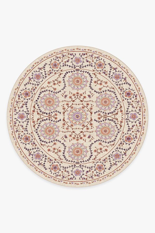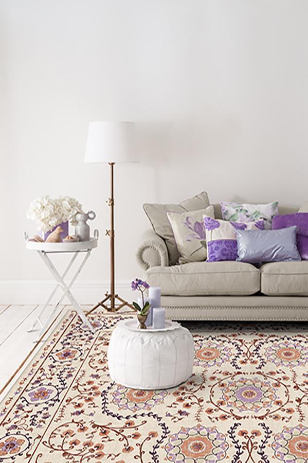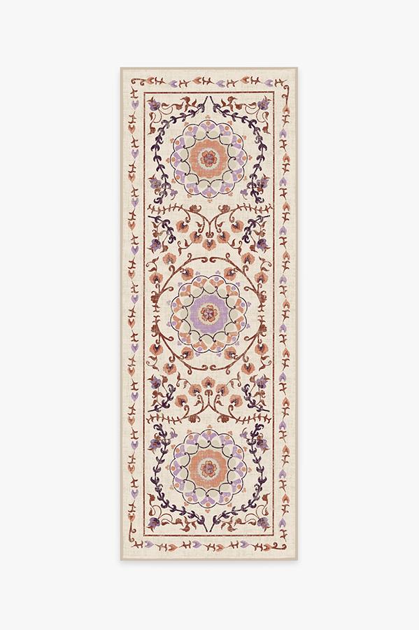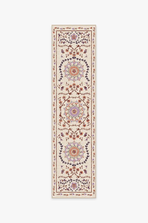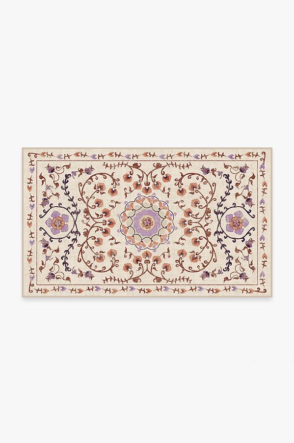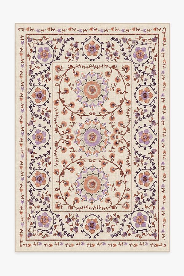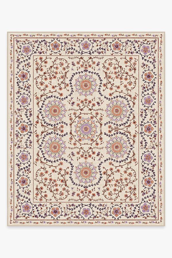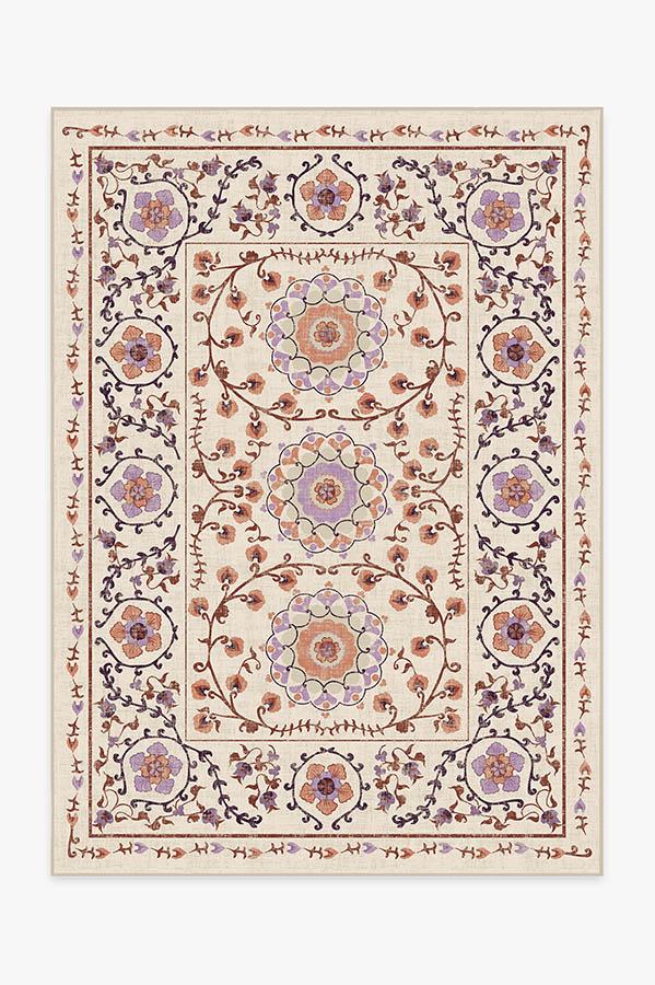 Elevate your home's interior with our Suzani Purple Rug. This bordered floral rug features a delicate display of blooms and vines in hues of royal purple, pink, and rust red on muslin. Complement any traditional or country cottage room in your home with this stately accent piece.